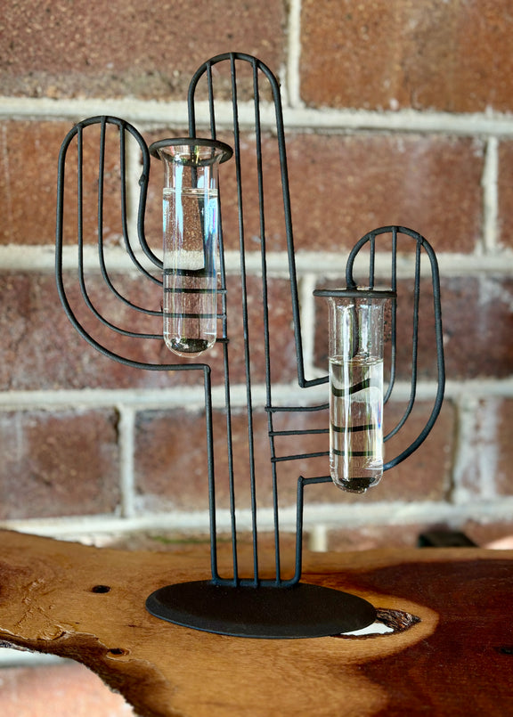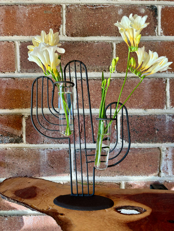 • Design: This plant holder is shaped like a stylized cactus, made from minimalist black metal wire. It features a single glass tube in the center, ideal for displaying a plant cutting or a small flower stem. The natural wooden base adds a rustic touch, contrasting nicely with the modern wire design.